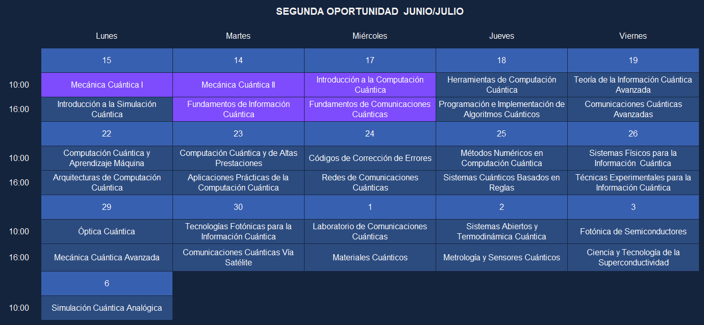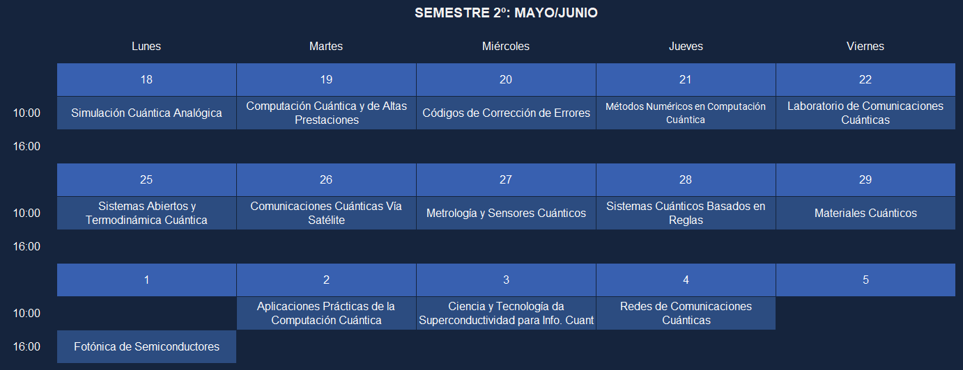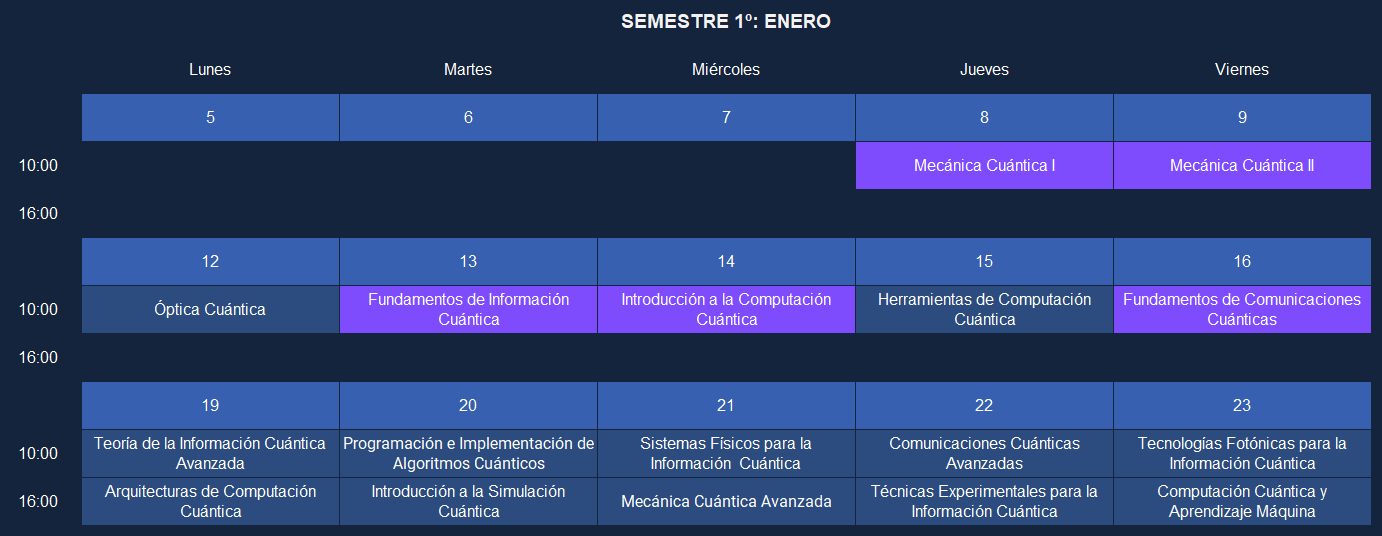 AULAS La docencia ser realizará en línea simultáneamente en las aulas siguientes: USC. Facultad de Física, aulas 2 y 4UVigo. Escuela de Ingeniería de Telecomunicación, aula T107UDC. Facultad de Informática, Seminario 2.2 HORARIOS SEMESTRE 1 Obligatorias Optativas Calendario SEMESTRE 2 Obligatorias Optativas Calendario EXÁMENES SEMESTRE 1 Obligatorias Optativas SEMESTRE 2 Obligatorias Optativas SEGUNDA OPORTUNIDAD Obligatorias Optativas Trabajos fin de máster TFM 2023/2024 Obligatorias Módulo Física de la Información Cuántica Módulo Comunicaciones Cuánticas Módulo Computación Cuántica Módulo de Optativas Libres